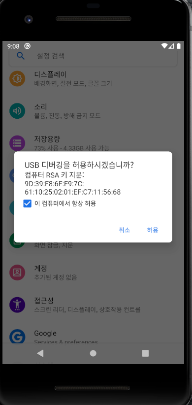 에뮬레이터를 실행하고 usb디버깅 허용 대화상자를 허용한 이후에(에뮬레이터를 실행하면 자동으로 뜹니다.:))