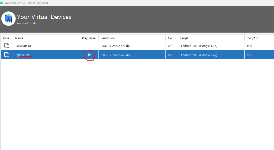 현재 제가 실행하고있는 AVD는 pixel2 기기 인데 [Tools] - [AVD Manager]를 열어보면 타겟이 Google Play로 되어있습니다. 처음 에뮬레이터를 생성 할 떄 기종별로 타겟을 GooglePlay 또는 GoogleAPIs로 생성 할 수 있습니다. 해당 Error가 뜨지않고 root권한으로 adb를 재시작하려면 상단의 Nexus 6 에뮬레이터를 실행해서 adb root 명령어를 입력하면 손쉽게 해결 할 수 있습니다. :)
